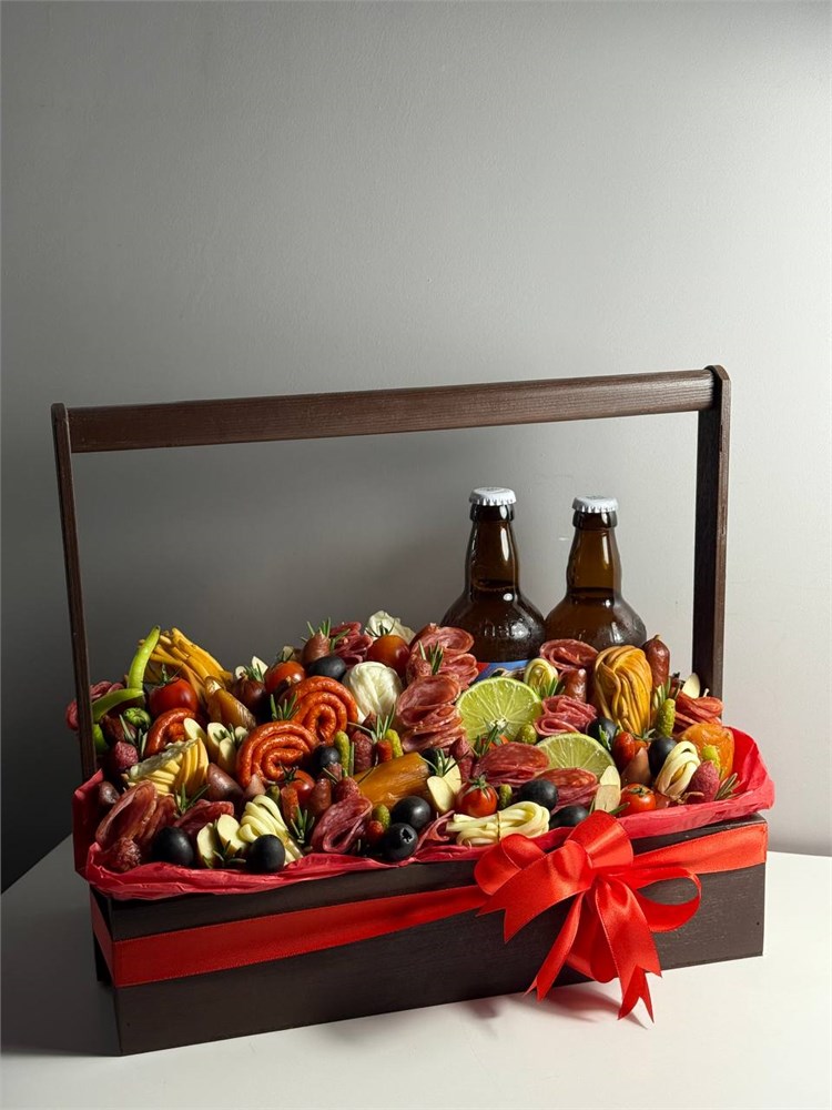 Мужские букеты это замечательный подарок на любой праздник! Букеты на любой мужской вкус, разных форм и размеров ! Мужские букеты отличное решение ведь можно или выбрать букет , который понравился на нашем сайте или заказать свой вариант вкусного подарка. Букеты бывают колбасный — мясные , сырные, букеты из рыбы или букеты из раков. Букет можно собрать в ящике в корзине или в форме конверта или букета. Данная композиция выполнена в ящике -что делает ее еще краше -ведь деревянные ящики и боксы -только украшают подарок. Вы можете добавить букеты, ингредиенты которые нравятся вашему мужчине, а также деревянную табличку или открытку.