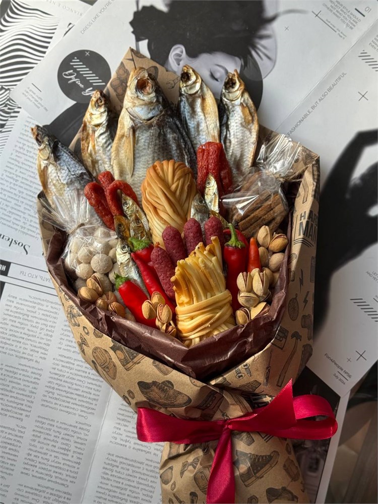 Мужской съедобный букет с рыбой, колбасками, сыром №12